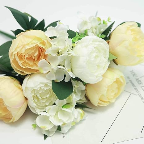 Amazon Com Efavormart 2 Bushes Light Yellow White Peony And Hydrangea Artificial Silk Flower Bouquets For Wedding Home Floral Arrangement Home Kitchen