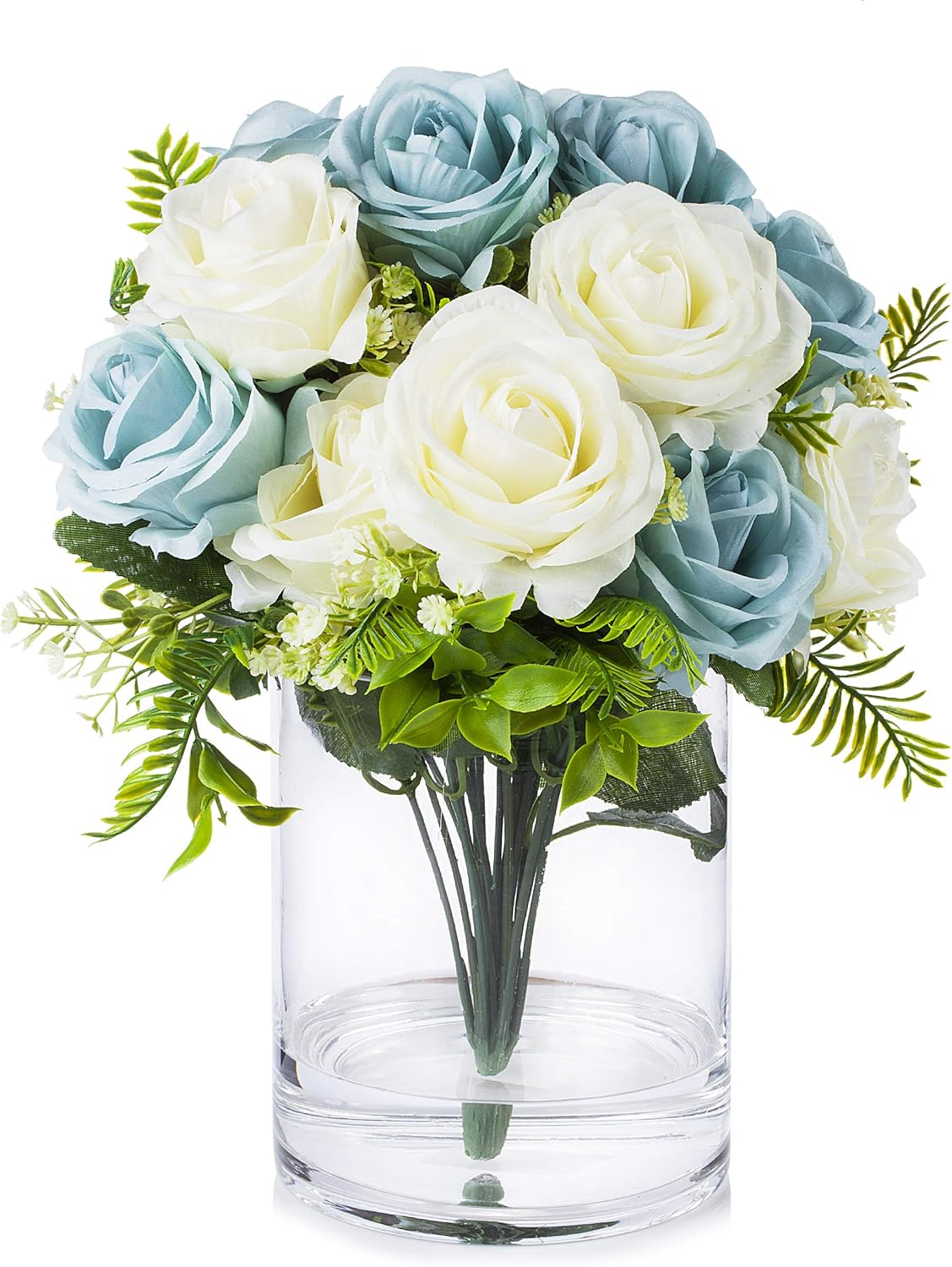Amazon Com Enova Home 18 Heads Artificial Rose Flower Arrangement In Glass Vase With Faux Water For Home Wedding Centerpiece Blue Cream Furniture Decor