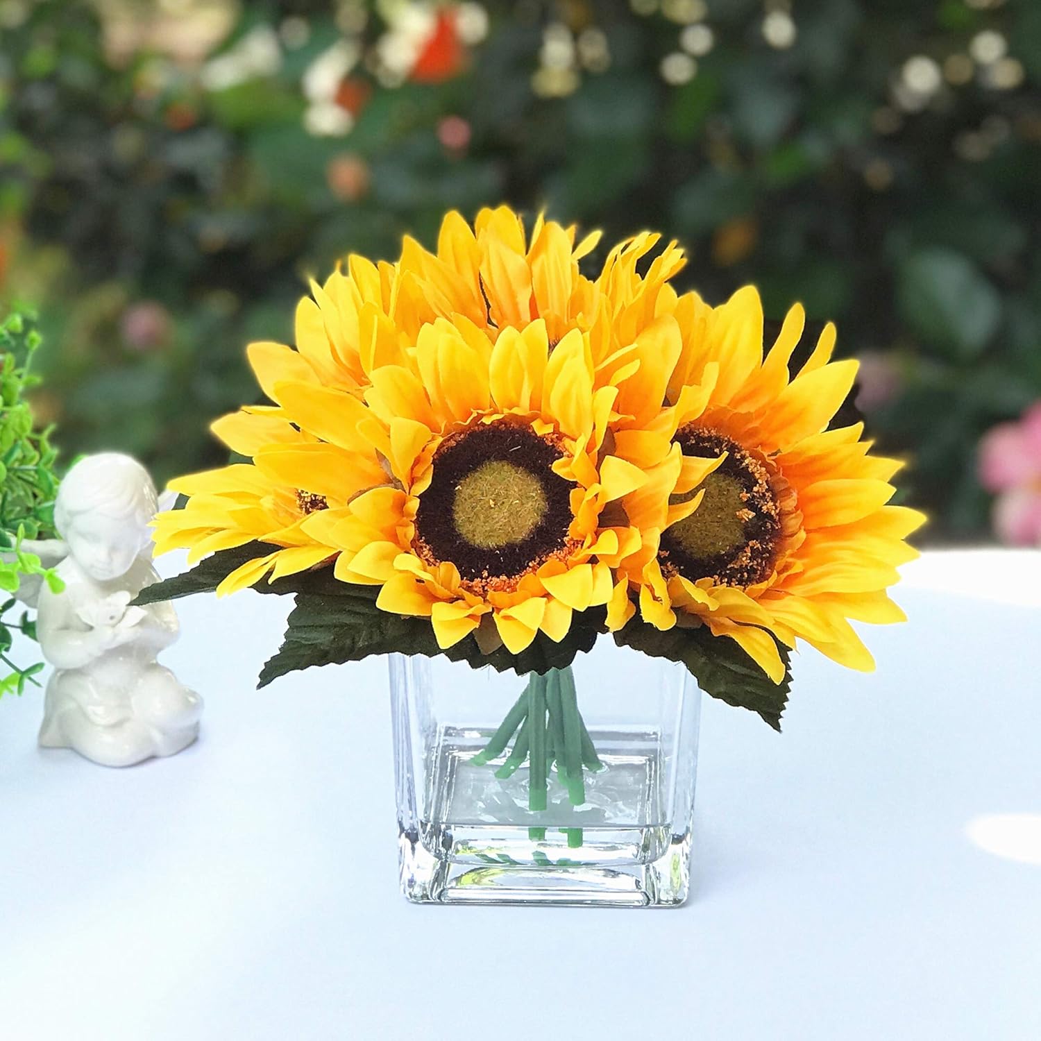 Amazon Com Enova Home 6 Heads Silk Sunflower Arrangement Flower Centerpiece In Clear Glass Vase With Faux Water For Home Decoration Home Kitchen