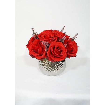 Amazon Com Sweet Home Deco Silk Rose Arrangement Silver Vase Table Flower Arrangement Home Decoration Wedding Centerpiece Red Home Kitchen