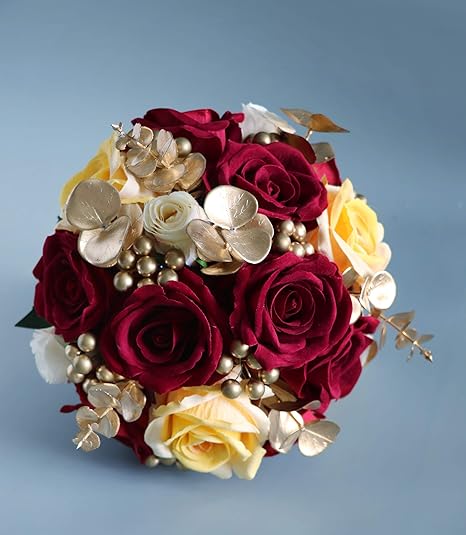 Amazon Com Abbie Home Burgundy Gold Bridal Wedding Bouquet Real Touch Silk Rose In Champagne With Gold Beads Eucalyptus Decoration For Wedding Vow Renewal Kitchen Dining