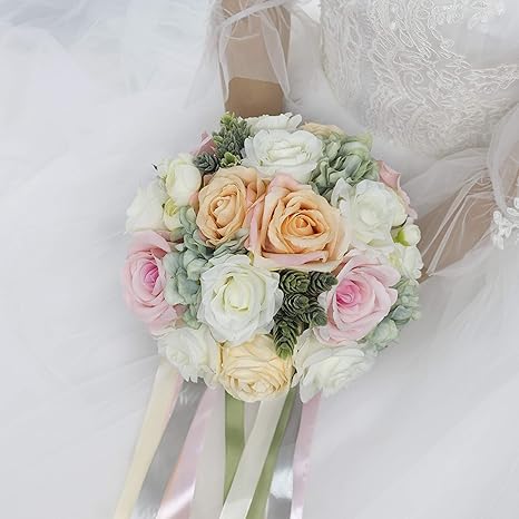Amazon Com Abbie Home Bridal Rose Bouquet 9 Inch Champagne Pink And White Blooming Rose Hydrangea Real Touch Wedding Flowers With Succulents Decoration Home Kitchen