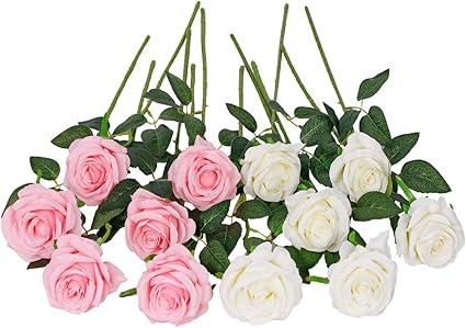 Bouquets Material The fake rose flowers are made of high quality silk designed by excellent craftsman. 6 stems artificial red roses. 6 stems artificial white roses.