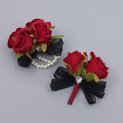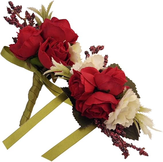 Amazon Com Evniset 2pcs Bride Groom Wrist Corsages And Boutonnieres Set Wedding Flowers Red Kitchen Dining