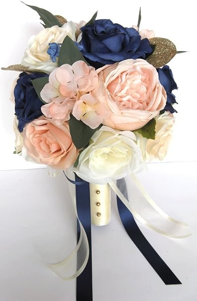 Amazon Com 17 Piece Wedding Bouquet Package Bridal Bouquets Artificial Silk Flowers Peach Blush Navy Blue Cream Gold Flower Bouquet Rosesanddreams Home Kitchen
