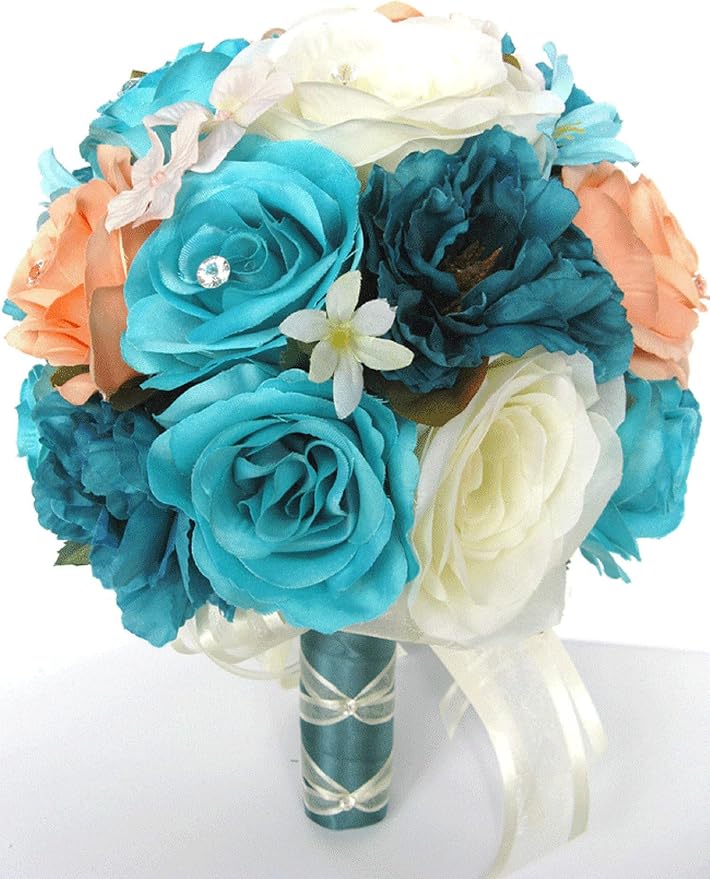 Amazon Com 17 Piece Wedding Bouquet Package Bridal Bouquet Set Teal Peach Aqua Turquoise Silk Wedding Flowers Bridesmaid Bouquets Rosesanddreams Bride Bouquet Corsage Boutonniere Home Kitchen