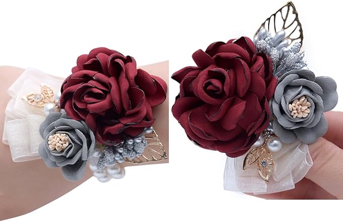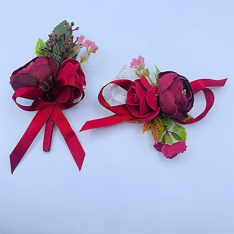 Fiwisora Dark Red Satin Rose Wrist Corsage Boutonniere Wedding Bridal Bridesmaid Wrist Corsage Wristband And Men S Groom Bridegroom Boutonniere For Wedding Prom Party Homecoming Arts Crafts Sewing Amazon Com