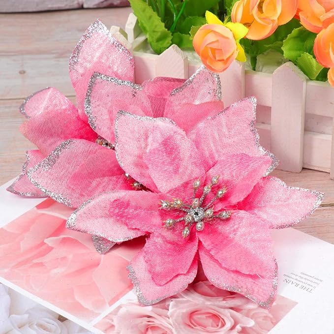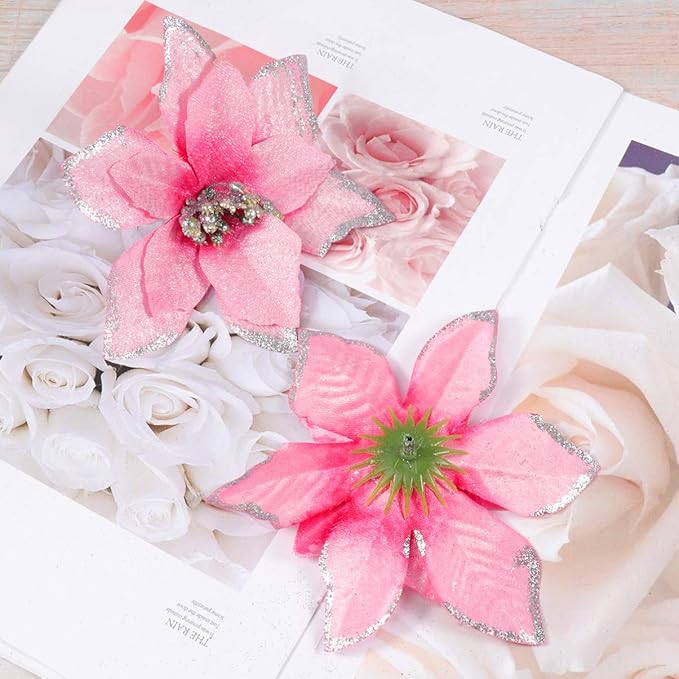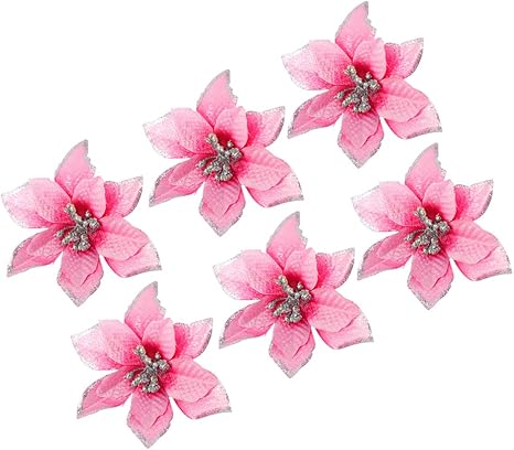 Amazon Com Nuobesty 24pcs Glitter Poinsettia Christmas Tree Ornaments Artificial Poinsettia Flower For Christmas Decorations Pink Furniture Decor
