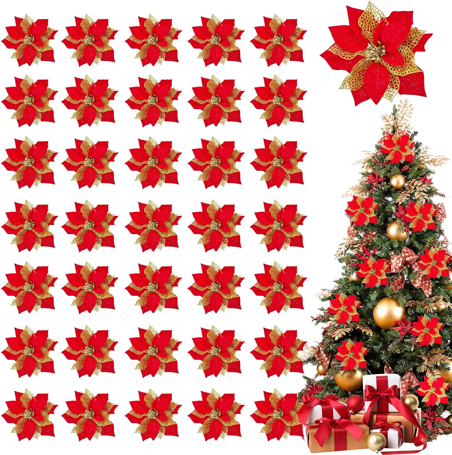 WILLBOND 36 Pieces Glitter Poinsettia Christmas Tree Ornament Christmas Flowers Decor Ornament Artificial Poinsettia 346 Inches Red Christmas Poinsettia Style 36 out of 5 stars. 3 x metallic gold clip on poinsettia flower christmas tree decorations 25cm wild glam collection stunning clip on poinsettia flower christmas tree decorations in metallic gold with gold sparkle finish set of 3 approx 25 cm perfect to clip onto the christmas tree wreaths garlands swags etc can also be used for decorating at any other time of the year make lovely wedding. Artificial Christmas flowers with glitter easy to attach to the tree the simplicity design adds festive atmosphere for Christmas.