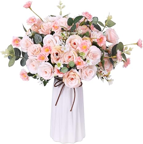 Amazon Com Ly Emmet Artificial Rose Bouquets With Ceramics Vase Fake Rose Flowers Decoration For Table Home Office Wedding Pink Home Kitchen