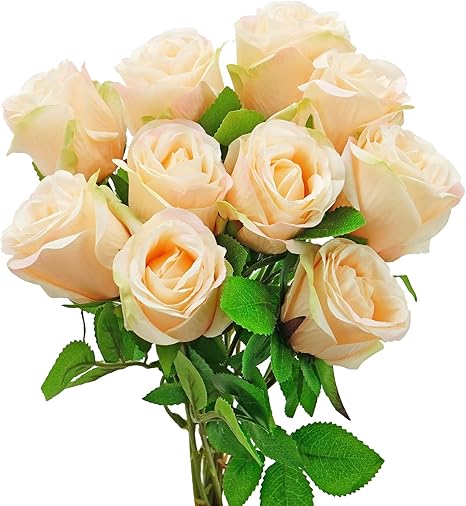 Amazon Com Lsme 10 Pcs Artificial Rose Flowers Champagne Single Stem And Green Leaves Wedding Bridal Bouquet For Home Party Decoration Kitchen Dining