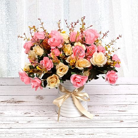 Amazon Com Yuyao Artificial Flowers Rose Bouquets With Vase Fake Silk Flower With Ceramic Vase Modern Bridal Flowers For Wedding Home Table Office Party Patio Decoration Pink Home Kitchen