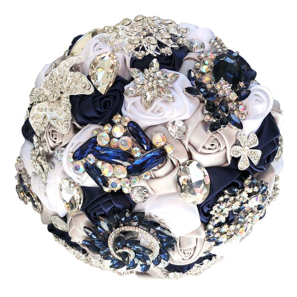 Abbie Home Brooch Bouquet Elegant Navy Blue Rhinestone Gem Sparkle Brooches Wedding Satin Rose Bridal Holding Flower Silk Flower Arrangements