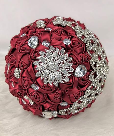 Amazon Com Abbie Home Sparkle Rhinestone Brooch Bouquet Satin Rose Bridal Bouquet Quinceanera Wedding Flower With Crystal Jewelry Ribbon Decor Burgundy Furniture Decor